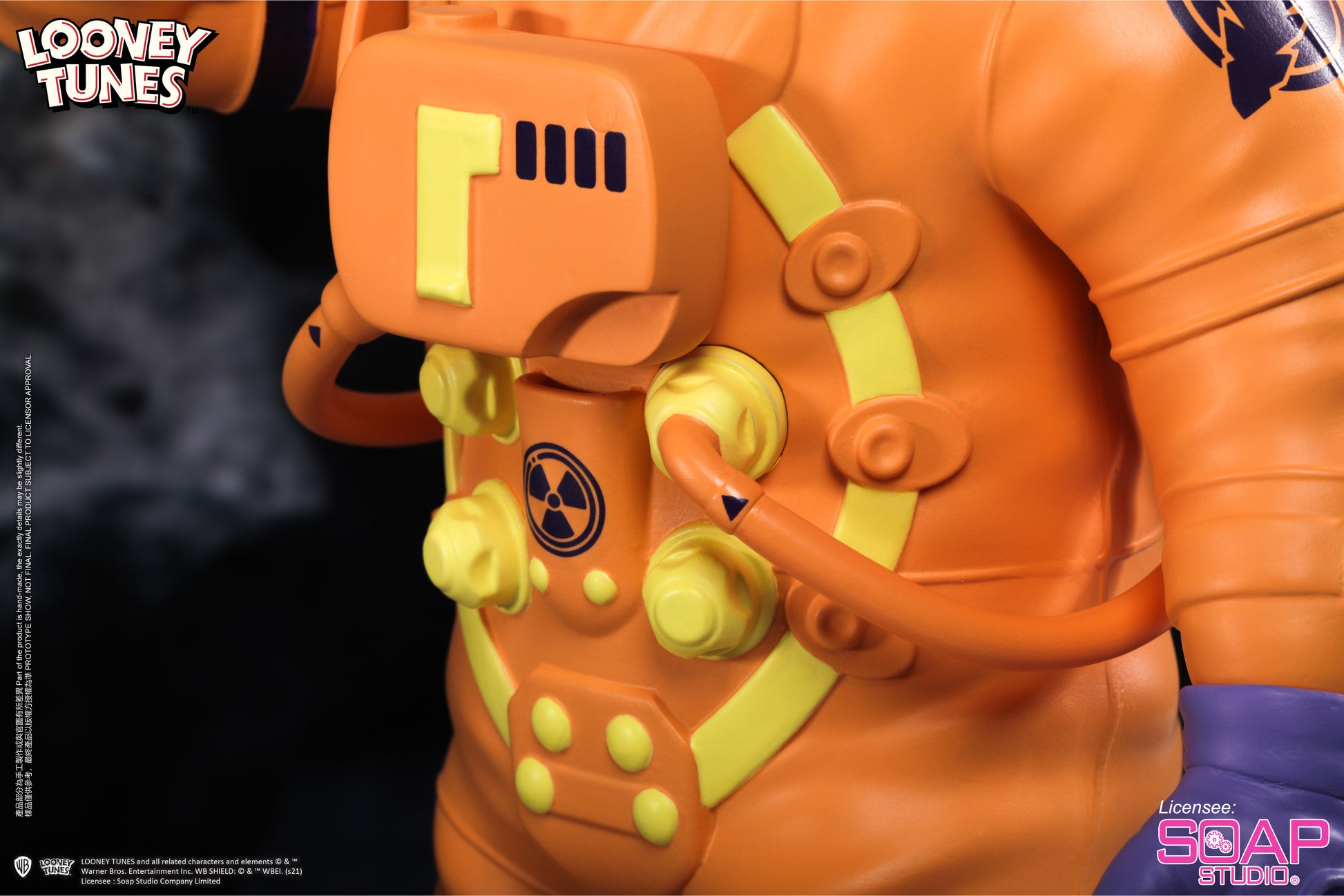 Bugs Bunny wears an orange spacesuit and a shiny plated helmet in an overlooking pose. And the exposed rabbit ears on top of the helmet and a huge BUGS BUNNY logo on the back of his add an amusing atmosphere to Bugs Bunny. The helmet can slide to open to reveal Bugs Bunny’s excited face as if he is finding a magnificent spectacle of the moon. The buttons and tubes of the spacesuit and the huge backpack giving a feeling of high technology; thickness and a "textured" look of the clothing, gloves, and shoes are real to nature.