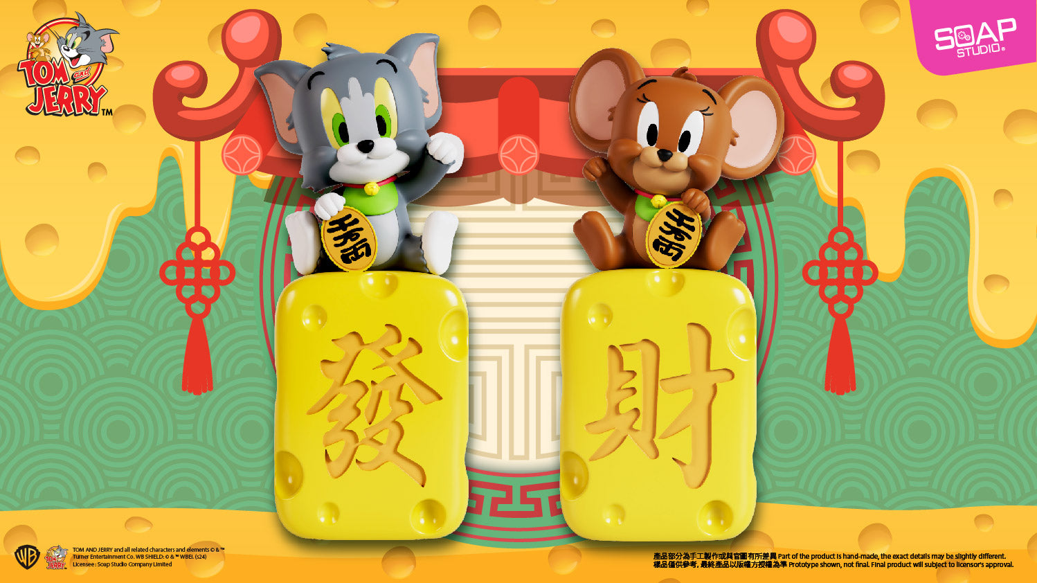 These two figures feature the beloved classic animation characters Tom and Jerry, blended with the traditional design of lucky cats to create a unique and meaningful decoration. Tom sits atop a mahjong tile engraved with the character "發" (prosperity), raising his left paw with a sly expression, while Jerry perches on a tile engraved with "財" (wealth), lifting his right paw and flashing his signature mischievous grin. Due to the magnetic design at the base of each character, they can easily attach to their respective mahjong tiles to ensure stability. When displayed together, the two figures spell out "發財" (prosperity and wealth), adding a cheerful and auspicious touch to any space.
