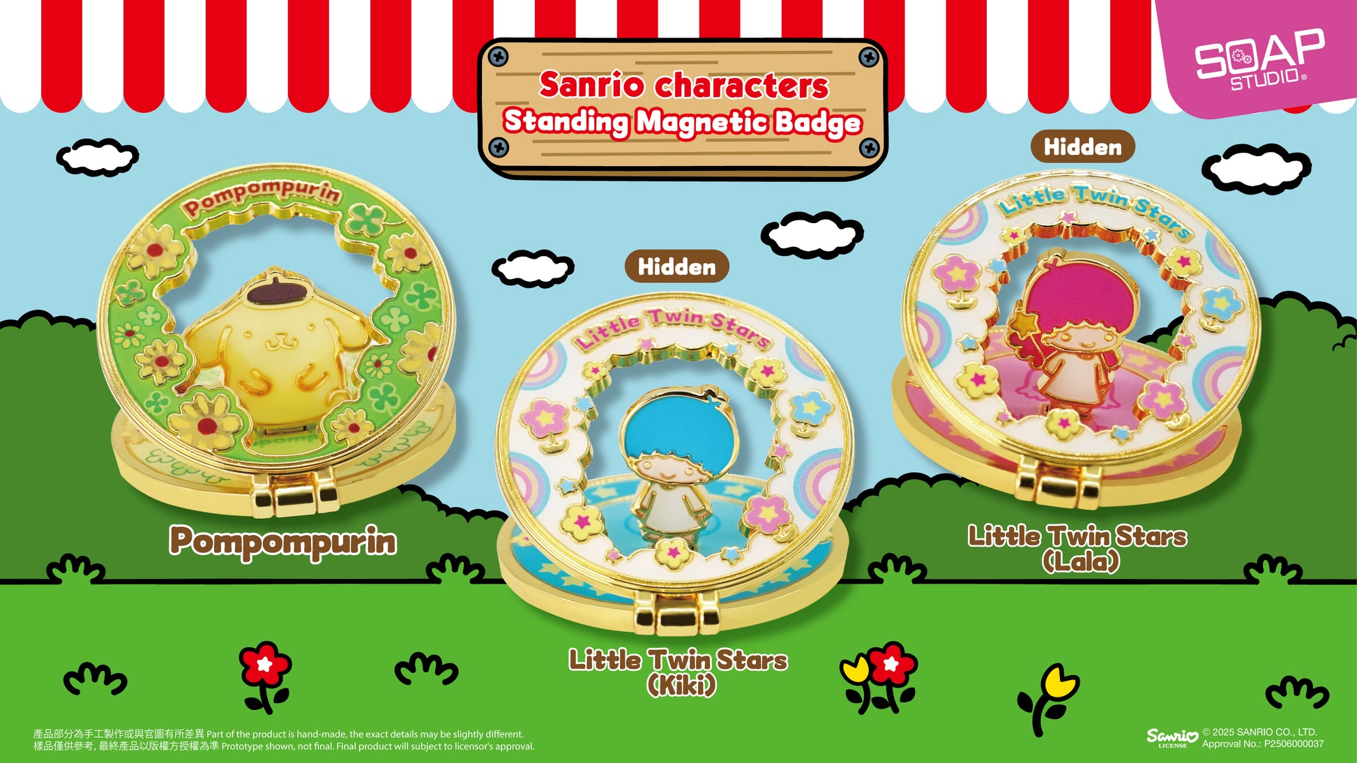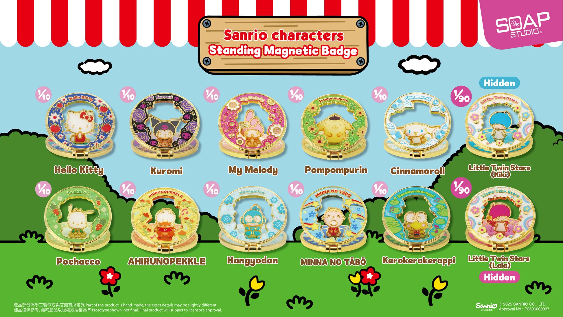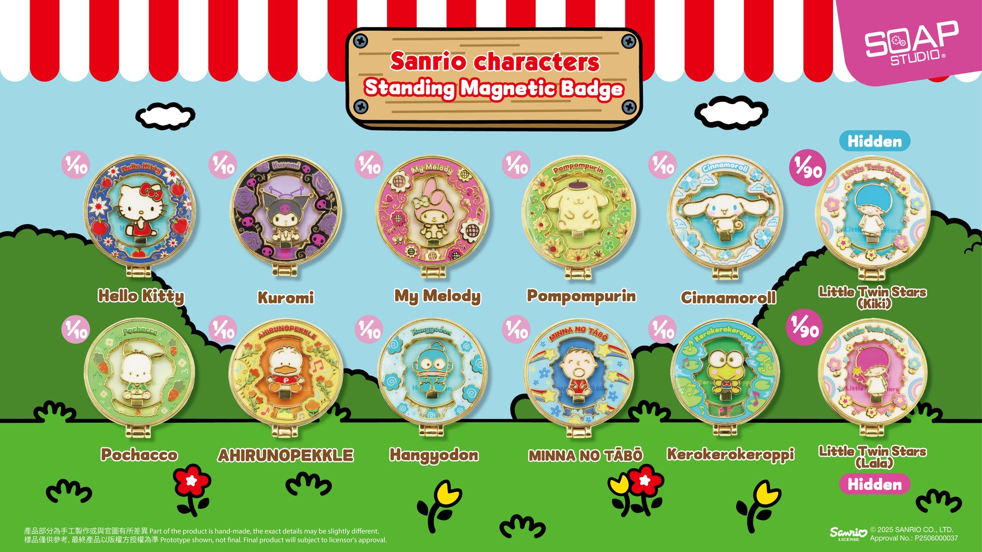Sanrio人氣角色變身磁吸徽章盲盒,造型圓潤可愛,細節滿滿!每款徽章可吸附在金屬表面,或掛在包包與衣物上作為造型徽章,還能打開背架站立擺放,搖身一變成為迷你桌上擺設。共有Hello Kitty、Kuromi、My Melody、Pompompurin、Cinnamoroll、Pochacco等10位角色登場,還有隱藏版Little Twin Stars等待你去發掘,為你的收藏增添驚喜!