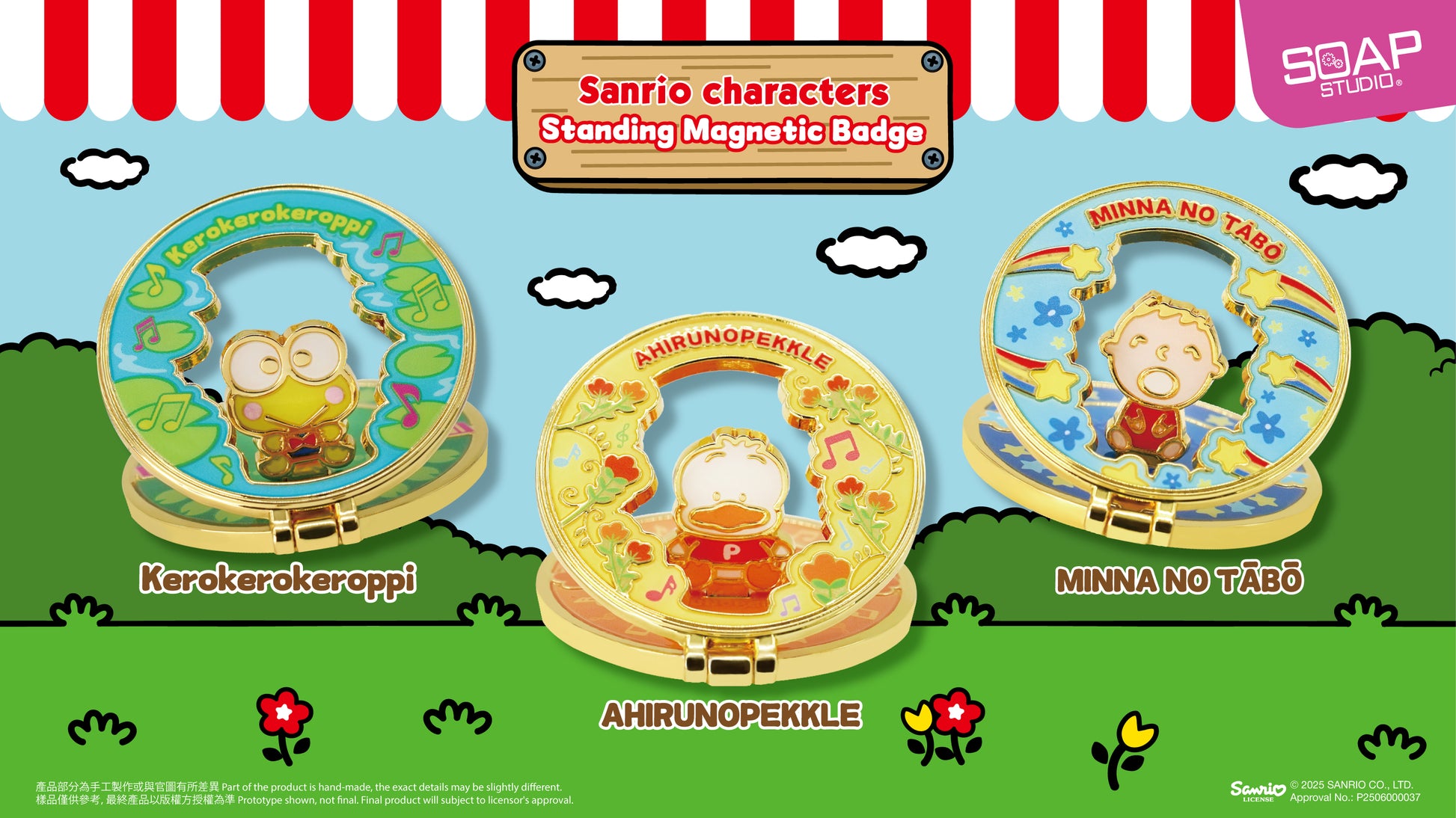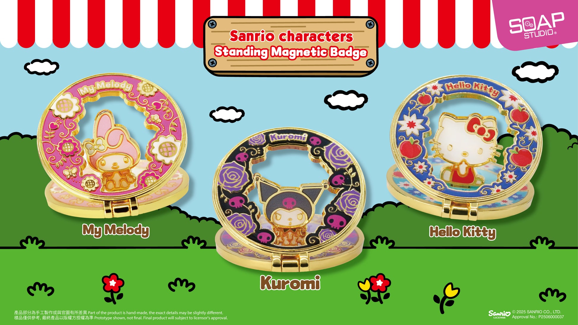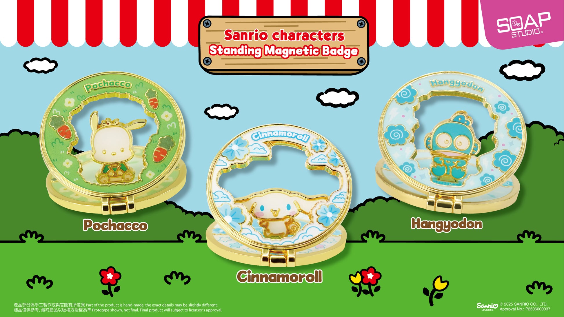 Sanrio人氣角色變身磁吸徽章盲盒,造型圓潤可愛,細節滿滿!每款徽章可吸附在金屬表面,或掛在包包與衣物上作為造型徽章,還能打開背架站立擺放,搖身一變成為迷你桌上擺設。共有Hello Kitty、Kuromi、My Melody、Pompompurin、Cinnamoroll、Pochacco等10位角色登場,還有隱藏版Little Twin Stars等待你去發掘,為你的收藏增添驚喜!