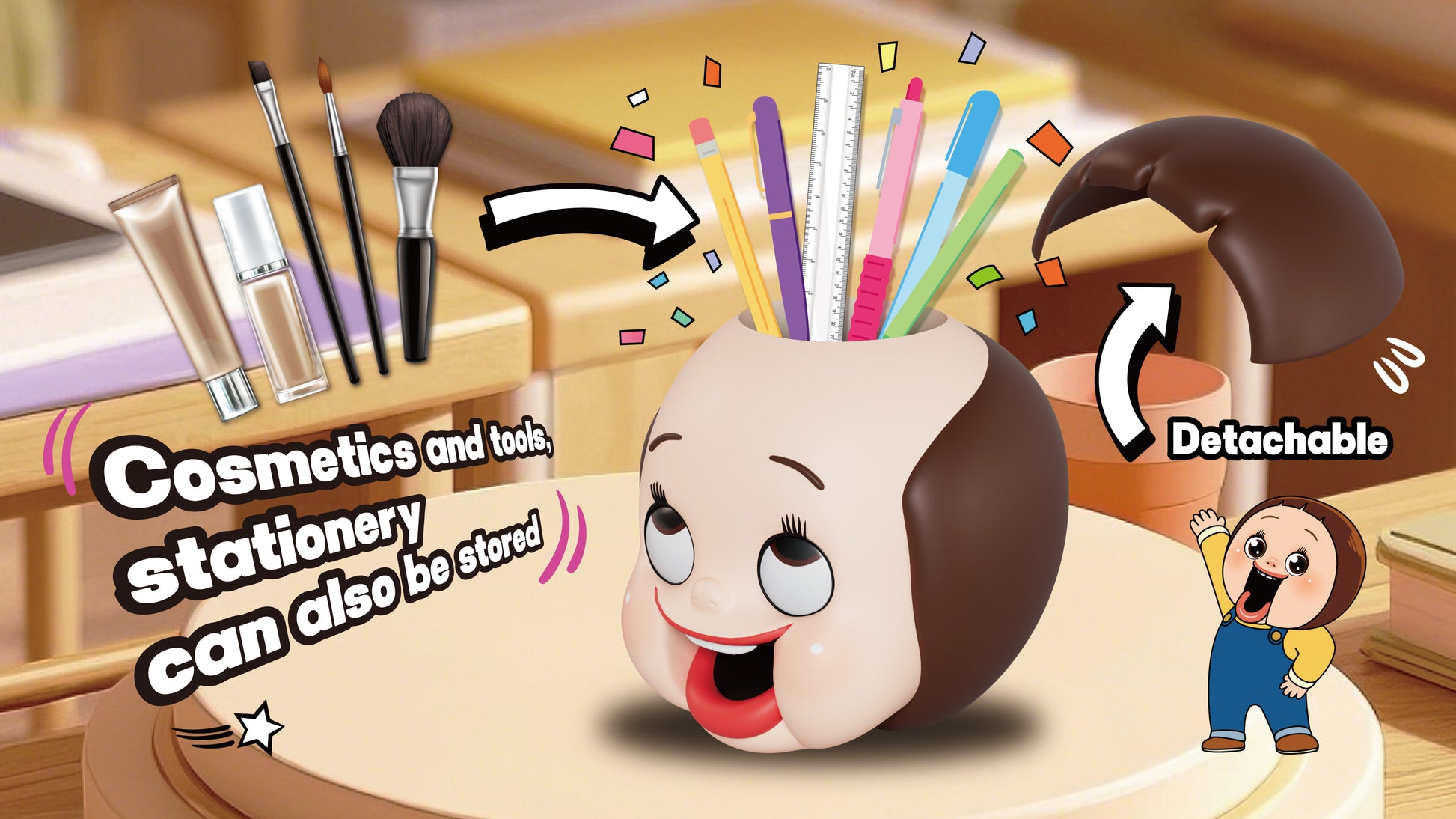 專為追求實用與風格的您而設計。這款約11cm高的收納盒,以燦子的頭部造型為特色,瞬間為您的生活空間增添一抹活潑的色彩。無論您是正在工作或在整理日常用品,只要輕輕掀開它的頭髮部分,便可把各種文具和小物件隨之放進入它的懷抱,讓收納變得如此簡單而有趣。它不僅是一個實用的收納盒,讓您的整理變得輕鬆有趣,更是您生活空間中的小藝術品。