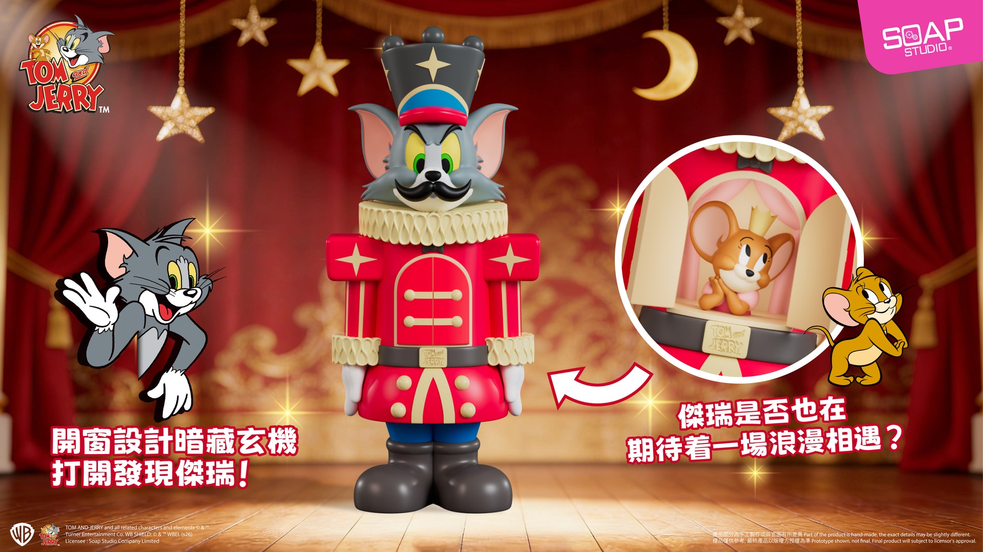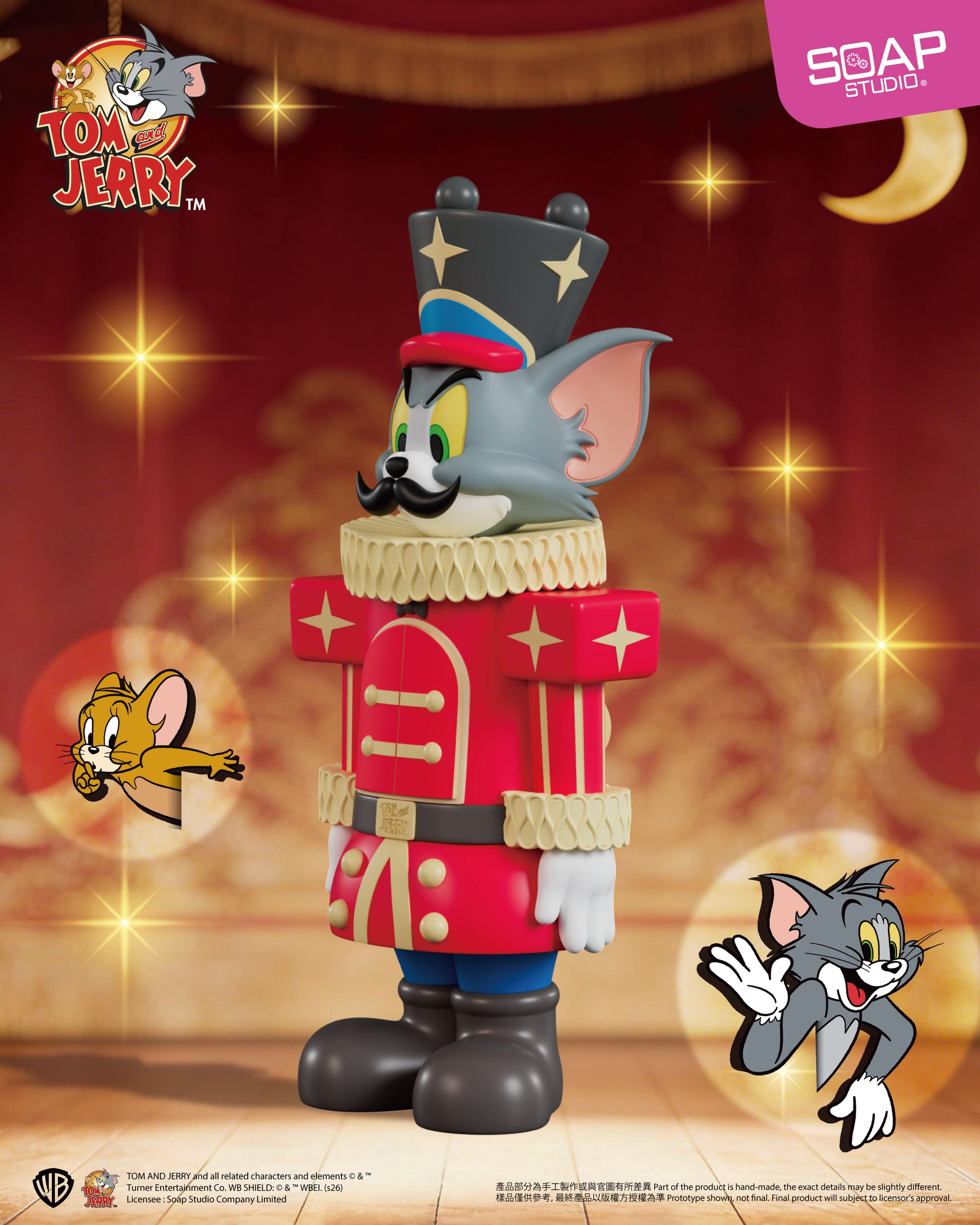 以經典芭蕾舞劇《胡桃鉗》為靈感,Soap Studio 將《湯姆貓與傑利鼠》化身為優雅又趣味十足的胡桃鉗士兵造型,搭配舞台燈光般的華麗背景,演繹節慶氣氛與收藏質感。
